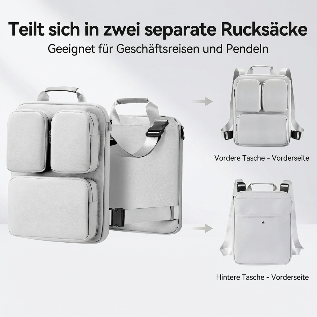 Die abnehmbaren Gurte ermöglichen einfaches Umwandeln in eine Laptop- oder Alltags-Umhängetasche für Pendeln oder Meetings.