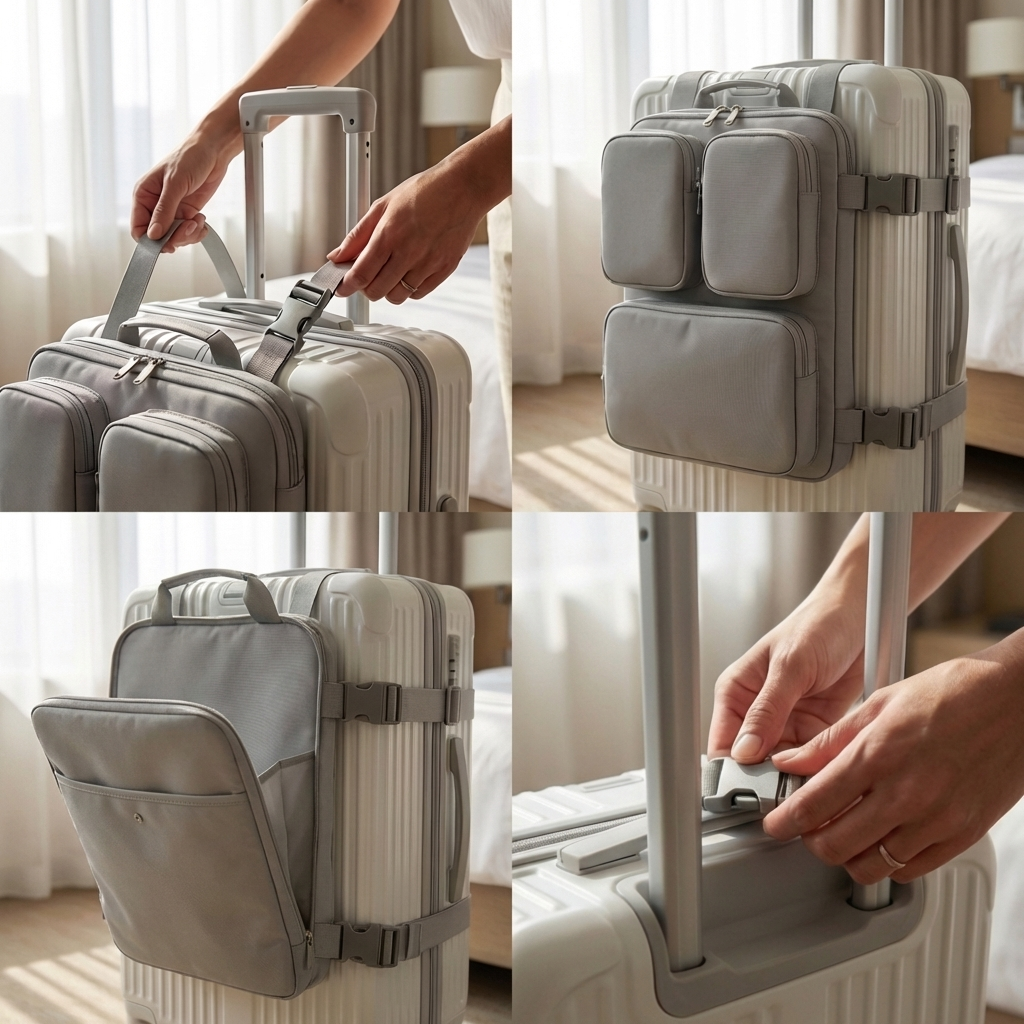 Die Tasche wird in wenigen Sekunden am Koffergriff befestigt und sitzt stabil während deiner Reise.